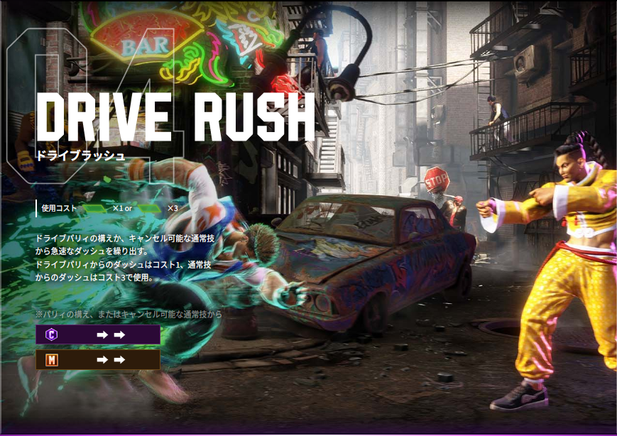 • 急速なダッシュで、ドライブパリィの構えか、キャンセル可能な通常技から繰り出せます。