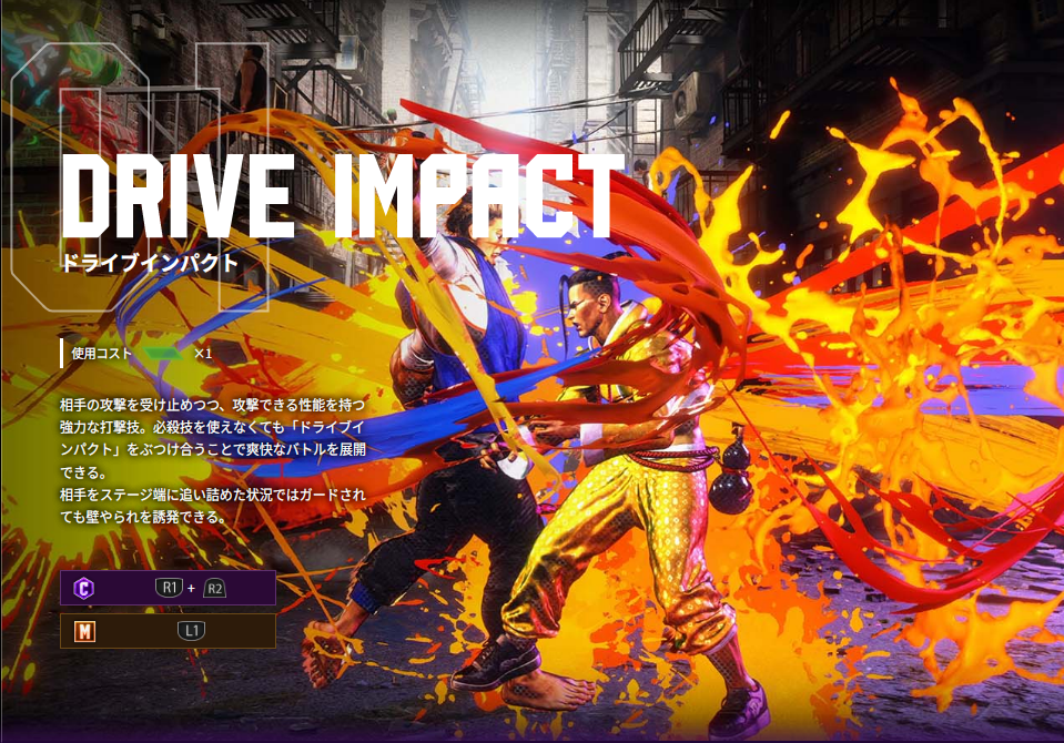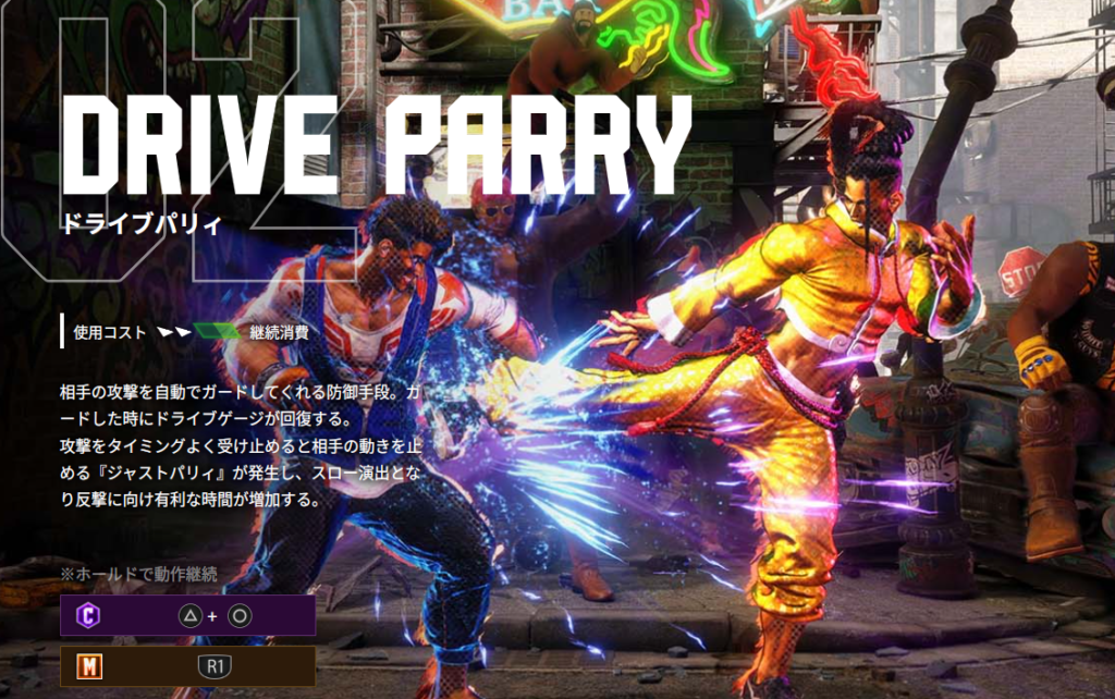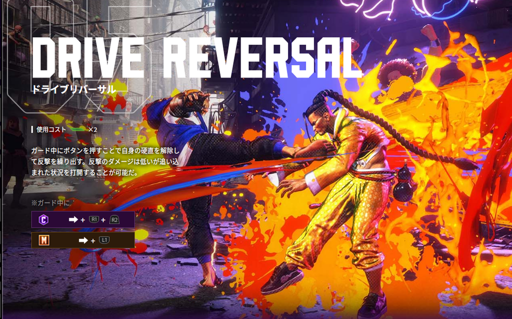 • 弱点:ドライブパリィ中の相手を投げるとパニッシュカウンター扱いになり、通常より大きなダメージを受け、さらにドライブゲージも削られます。